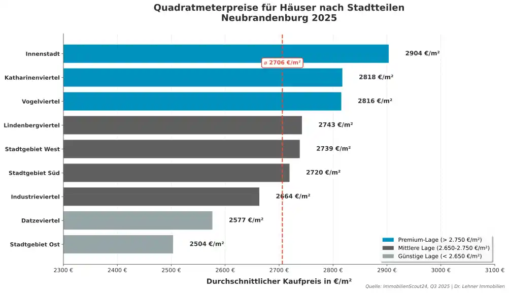 Ein Haus in Neubrandenburg kostet durchschnittlich 2.706 Euro pro Quadratmeter. Die Preisspanne reicht je nach Stadtteil von 2.504 €/m² im Stadtgebiet Ost bis 2.904 €/m² in der Innenstadt. Für ein typisches Einfamilienhaus mit 140 m² Wohnfläche müssen Sie mit Kaufpreisen zwischen 350.000 € und 410.000 € rechnen.